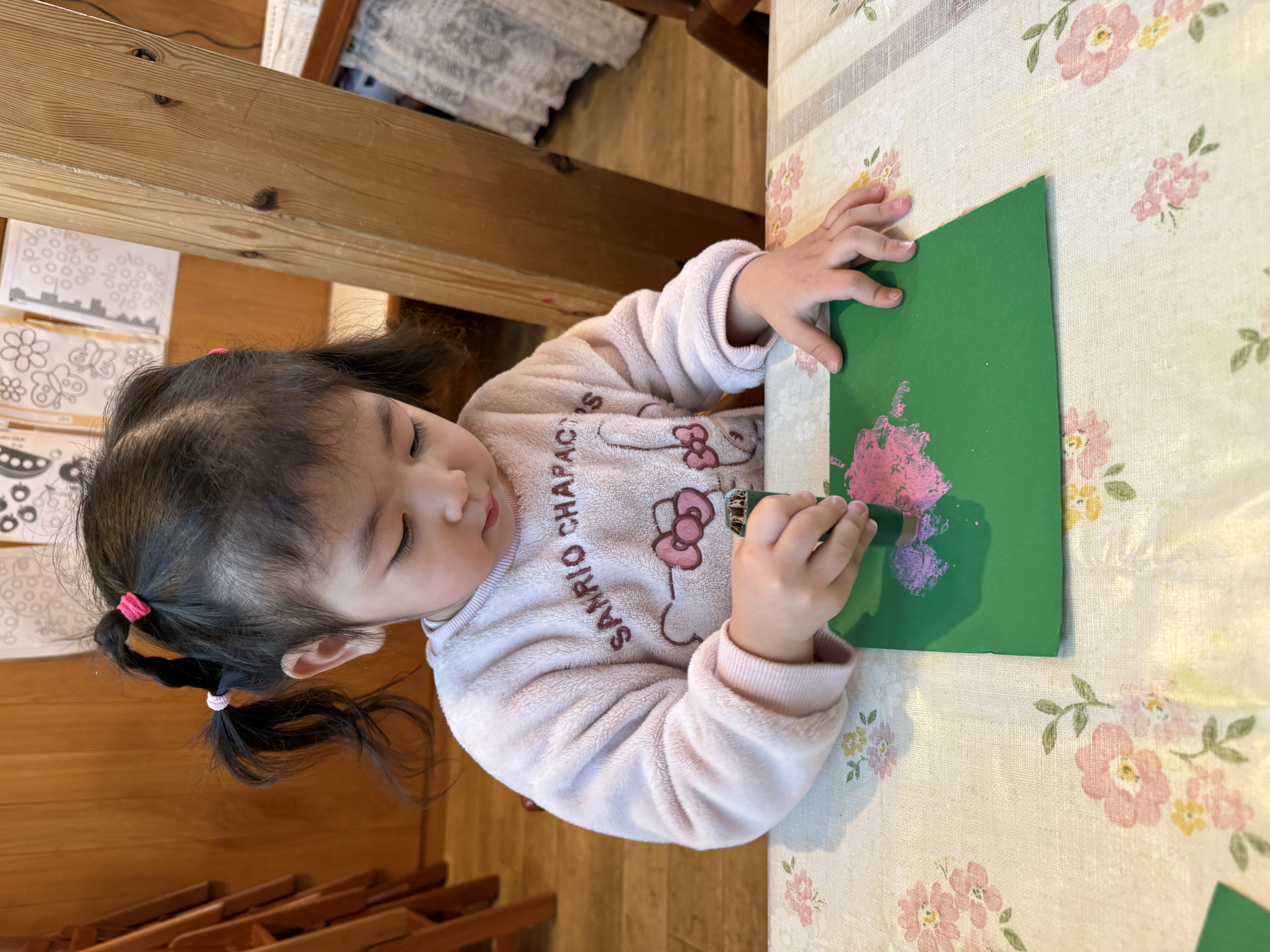 スタンプを押すたびに色がついていく様子を楽しみながら、お友だち同士で顔を見合わせたり、やりとりをしたりながら、和やかな雰囲気で取り組んでいました!!