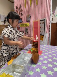 夏祭りでは、子どもたちが楽しんでいる“ハンバーガー屋さんごっこ”を基に、具材を積み上げるゲームを楽しみました☆日頃から、フェルトや段ボールを使ってハンバーガーの具材を作っており、自分たちで作った物だからこそ、より気持ちも高まっていたようです!また、盆踊りの活動では、たくさんの保護者の方前でも堂々と踊る姿が印象的で、行事ならではの雰囲気を存分に味わっていました☆