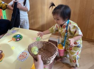 こいぬ組にとって初めての行事!ちょうちんなどの装飾や夏を感じられる音楽…普段と違う雰囲気にドキドキするお友達も。しかし、ママやパパ、お友達と一緒にゲームに挑戦すると、ニコニコ笑顔で大盛り上がり♪