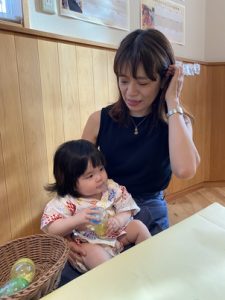こいぬ組のブースでは、音が鳴るボールを転がして、夏ならではの食べ物をゲット♪ボールが転がると、ママやパパと一緒に拍手をして大喜び!廊下には夏を感じられる大きな太鼓も!!叩くだけでなく、太鼓の音に合わせて踊って楽しむなど、それぞれの遊び方で楽しんでいました♪