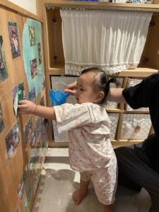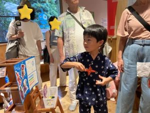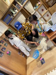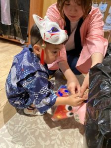 一人の子どものつぶやきから広がったおばけ・妖怪の興味をそのまま夏祭りの出し物盆踊りで!室内にみんなで作ったおばけヨーヨーや妖怪ポーズの写真が増えていくと「からかさおばけだ!」「シール貼った三つ目小僧♪」と喜ぶ姿が。また、盆踊りでも「おばけの花火音頭、踊りたい!」と何度もおばけになりきって楽しむ様子が見られました。当日は、普段と違う雰囲気や人の多さに緊張する姿も見られましたが、大好きなママやパパ、おじいちゃんおばあちゃんと一緒に夏祭りの雰囲気を楽しんだスピカ組でした♪