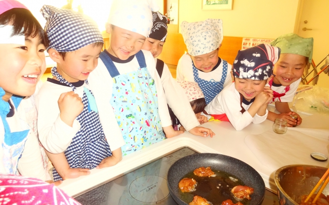 散歩中に見つけた菜の花を見て「菜の花から油作ってみたな~」という一人の子どものつぶやきをきっかけに、菜種油作りが作りが始まりました!菜の花畑や菜種油工場との交流経て、菜種から油をとる事に成功すると、「自分で作った油でから揚げを作りたい!」という新たな夢が生まれました。その夢の実現の為、様々な種や実を搾油して油作りを楽しみ、遊びは搾油機作りやアロマオイル作り、石鹸作りにまで発展☆最後はみんなで油を作りから揚げを作るという夢を達成しました!