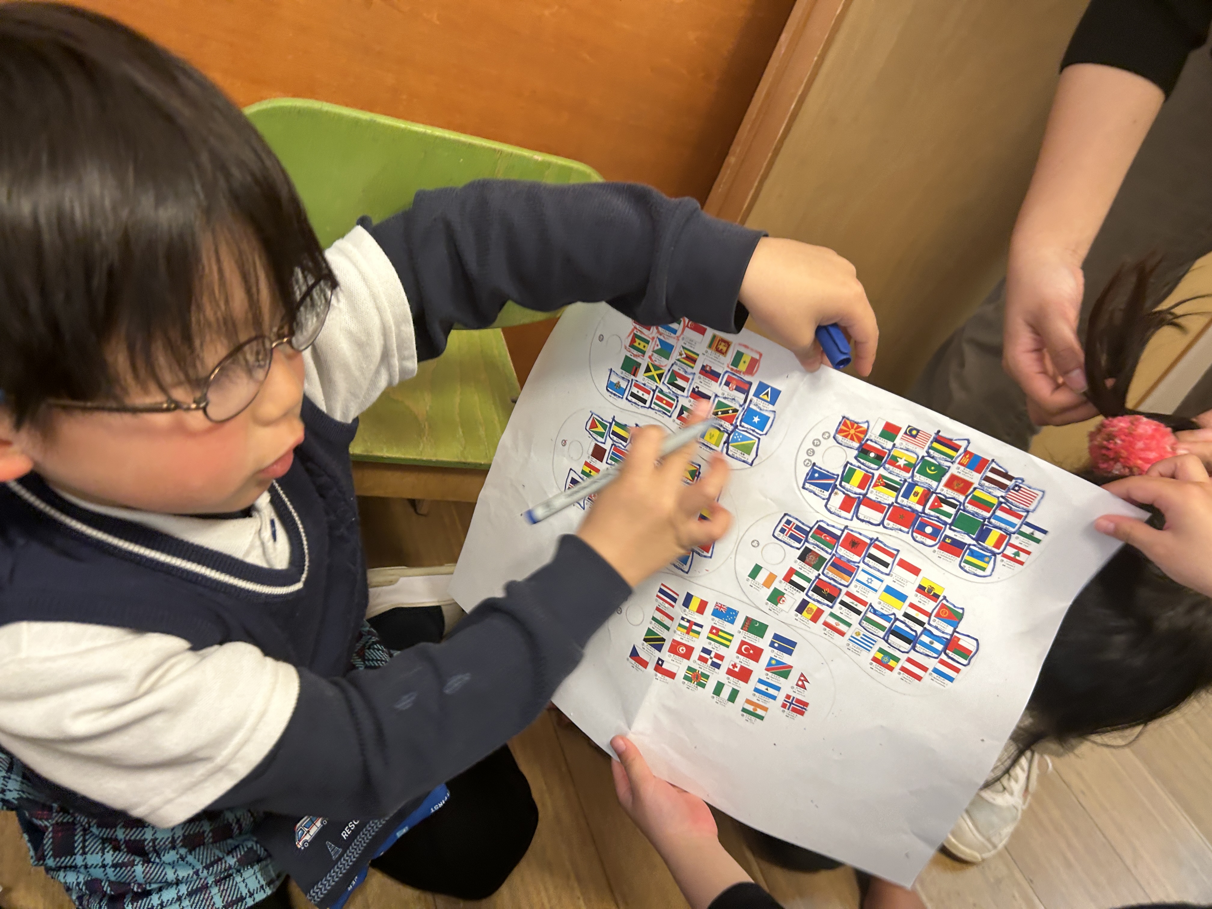 コーナーの時間では異年齢でも楽しむ姿がある中で、世界コーナーではペガサス組同士で楽しむ様子が!世界コーナーでは、国旗を覚えることや国旗クイズなどそれぞれ好きなことを楽しんでいます。